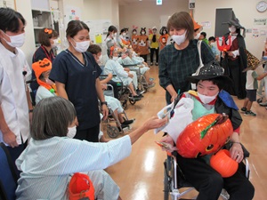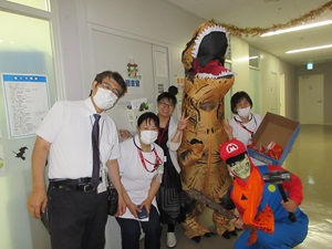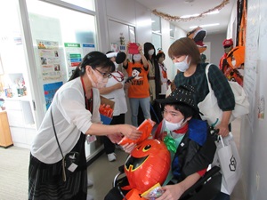 入院児やリハビリ通院児、小児科外来で来ていた子どもたちが仮装して、普段入れないような医局や薬局前等を通りたくさんのお菓子をいただき大満足な様子でした。